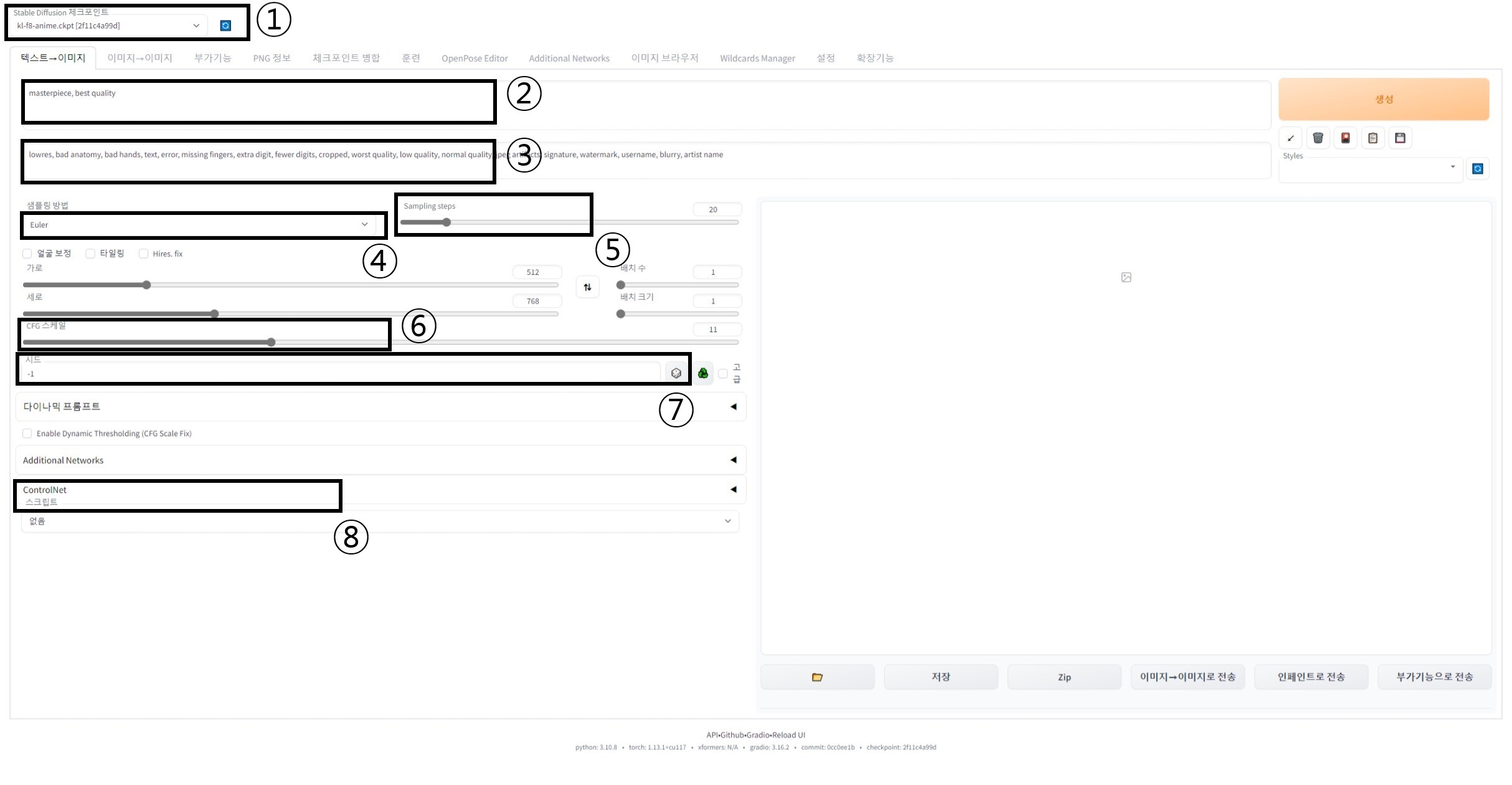 7. 시드 : 랜덤 하게 뽑는 것을 의미하는 게 -1(주사위)입니다. 그 옆의 초록색 버튼은 직전에 뽑은 이미지의 고유의 값을 불러내옵니다.)