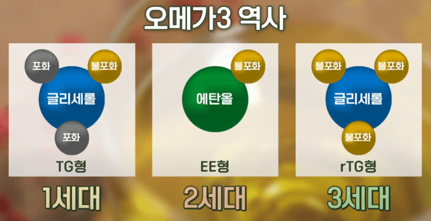 - TG형 오메가 3 : 포화지방산 2개와 불포화지방산 1개가 글리세롤에 결합한 형태